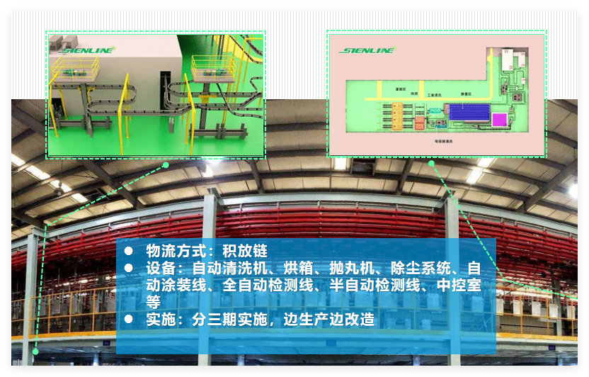● Equipment: Automatic cleaning machines, ovens, shot blasting machines, dust removal systems, automatic painting lines, fully automatic inspection lines, semi-automatic inspection lines, central control rooms, etc